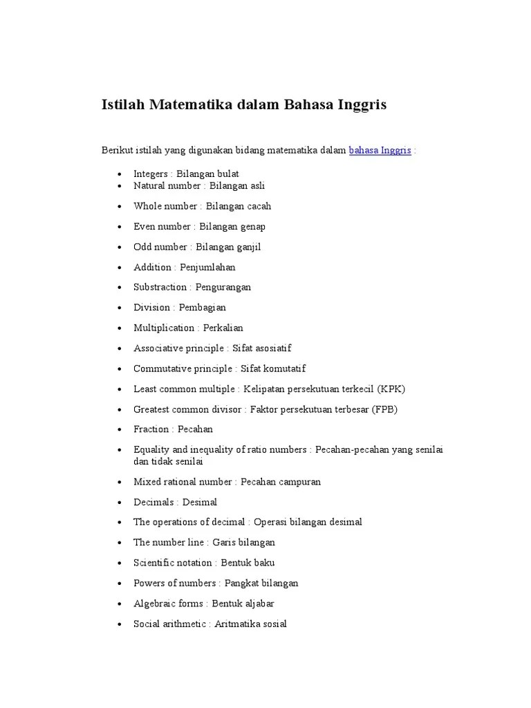 View istilah matematika dalam bahasa inggris.pdf from soal simak 2016081212 at binus university. Istilah matematika dalam bahasa inggris â berikut istilah yang digunakan bidang matematika dalamâ bahasa inggris : Kosakata metematika dalam bahsa inggris merupakan salah satu aspek terpenting. Pada kesempatan ini akan disajikan materi tentang istilah matematika . Sangat berbeda dengan jaman dulu, kini mengetahui istilah matematika dalam bahasa inggris sangatlah penting.